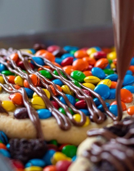 Vanilla cookie topped with M&Ms and Nutella drizzle.