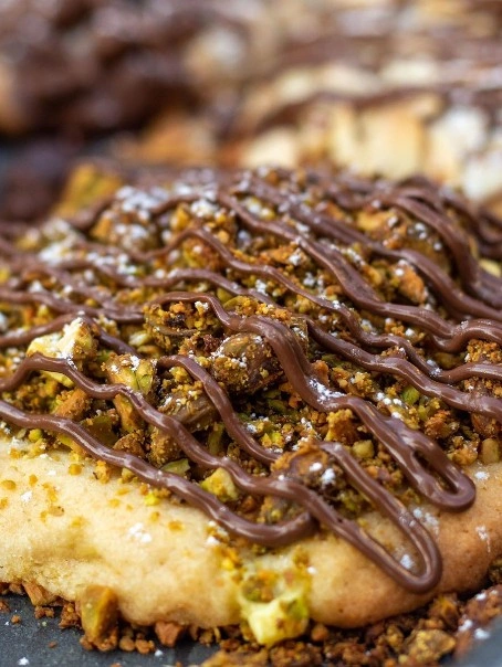 Vanilla cookie filled with Nutella, topped with pistachios and .