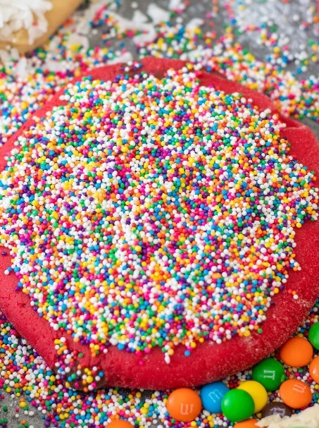 Red velvet cookie with colorful sprinkles.